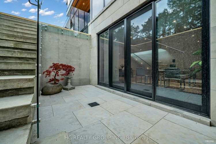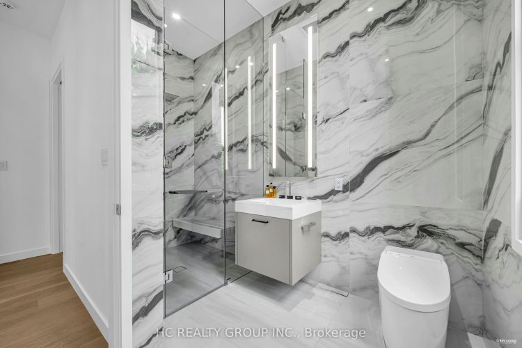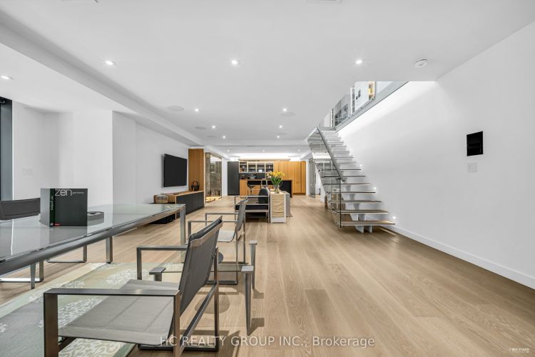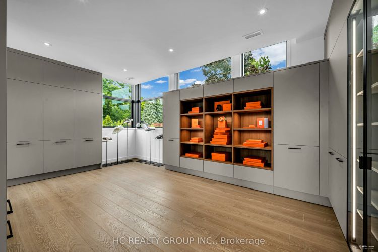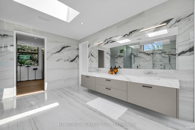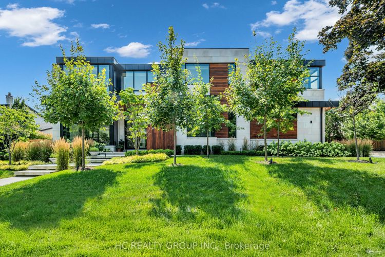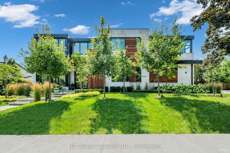An extraordinary modern estate of distinction, privately set on a tranquil cul-de-sac on a rare 107.34 foot frontage lot, showcasing a refined interplay of glass, stone, and light. Designed by award-winning architect David Small, the residence features polished Ontario white marble, European aluminum-clad wood windows, and professionally landscaped grounds with mature evergreens, integrated outdoor elements, and a full irrigation system. A generous three-car garage with extra-high ceilings accommodates vehicle lifts. The main level offers a guest bedroom and a gourmet kitchen with top-tier appliances and a walk-in pantry, complemented by radiant heated floors, wide-plank European white oak, floor-to-ceiling windows, and a striking 23-foot dining room ceiling with sculptural chandelier. Floating stairs with sleek glass railings elegantly connect all levels. The upper level presents a lounge, office, and four ensuite bedrooms, including a luxurious primary retreat with a spa-inspired ensuite featuring heated floors, dual custom marble-lite floating sinks, and an expansive dressing room with premium custom cabinetry and integrated LED lighting. The lower level is designed for elevated living, featuring a recreation room, climate-controlled wine cellar, nanny suite, and fitness room. Over $500,000 in premium custom German cabinetry throughout the home unifies the interiors with exceptional craftsmanship, modern elegance, and refined luxury.