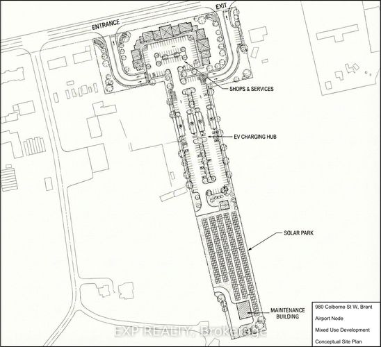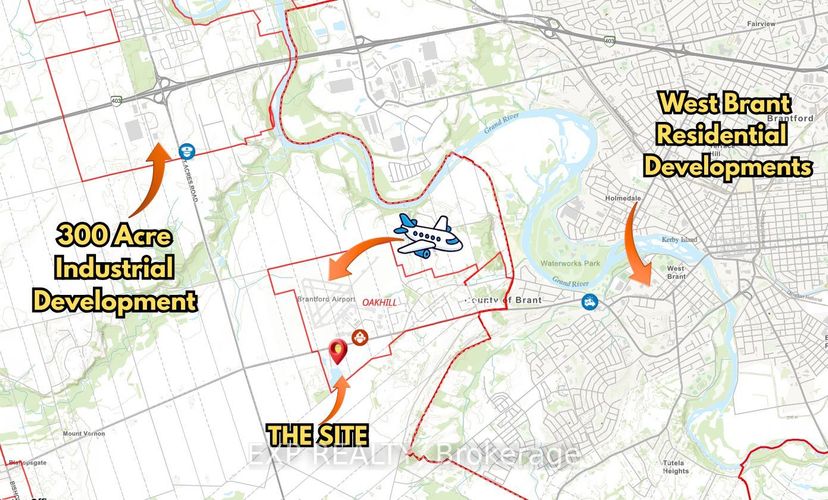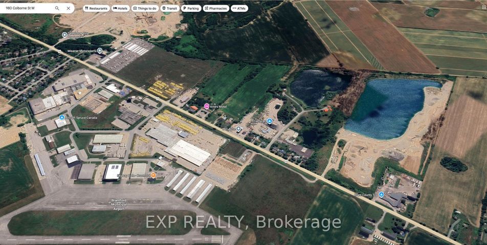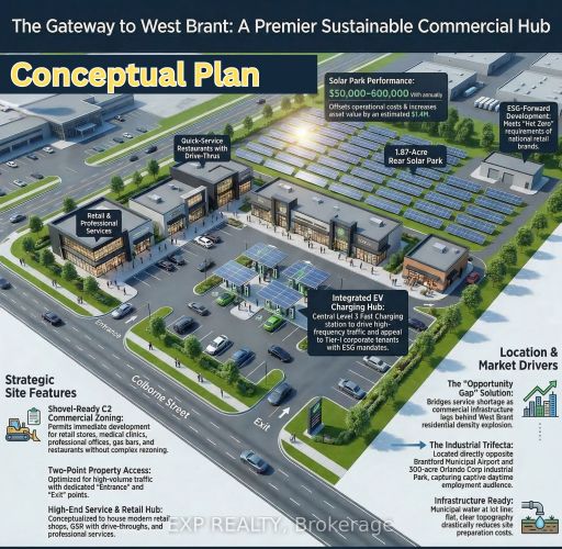 Share Sale Opportunity - Strategic Airport Commercial Service Node - 4.65 Acre C2 Commercial Assembly Directly across from the Brantford Municipal Airport (YFD) and minutes from Hwy 403, this property serves as the critical service node for West Brant's expanding industrial and residential growth. Located within minutes of the 350+ acre Industrial Park, 980-984 Colborne St W forms the primary commercial gateway to the area. A "paid to wait" asset offering strong holding income, green energy potential, and additional value-add opportunities. The unique T-shaped lot supports a "business in front, energy in back" strategy, among other possibilities including medical or institutional development. The 300+ ft C2 frontage includes income-producing buildings (retail, office, auto, with multiple 10, 12 and 14 ft clear height overhead doors, multiple structures, and a residential unit). Ideal for a wide range of permitted uses. The deep rear acreage is well suited for ground-mount solar (net metering), long-term care, or other future development concepts.Municipal water is available at the lot line. Strong cap rates and yield potential. All leases are month-to-month, providing immediate flexibility. Acquire this property with the potential to unmerge title for an immediate equity lift or position it as the cornerstone for a larger land assembly. Don't just buy land-acquire the cash-flowing epicenter of Brant's economic engine.